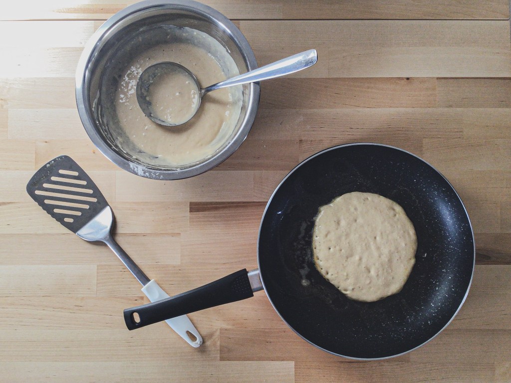 4. Once hot, scoop in a heaping 1/4 cup. Let cook for about 45 seconds- 1 minute or until you see bubbles on top, flip and repeat. (Check the middle of the pancake once in awhile to see if it’s cooked through. If it’s still wet lower the heat a little a cook for a bit longer.)